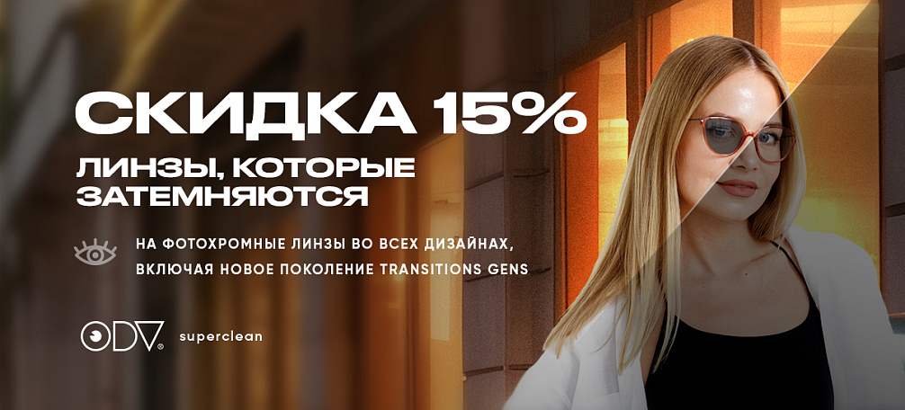Дарим скидку -15% на фотохромные линзы ODV во всех дизайнах, включая новое поколение Transitions Gen S в период с 1 февраля по 31 мая 2025 г.!